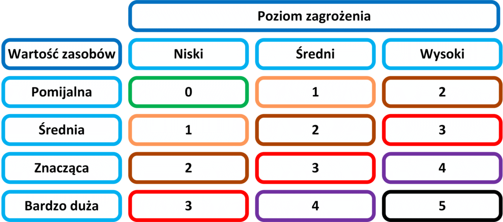 - Bardzo duża – Utrata lub uszkodzenie zasobu uniemożliwia funkcjonowanie firmy.
