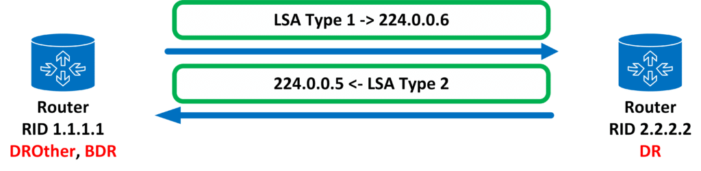 Ruter płonący rolę DR-a przetwarza wszystkie otrzymane wiadomości DBD, odpowiadając na nie tymi samymi wiadomościami wysłanymi na multicast-owy adres 224.0.0.5, zawierającymi wartości LSID struktur LSA Typu drugiego(LSA Type 2). Po ustaleniu brakujących struktur LSA, rutery wymieniają pomiędzy sobą jedynie brakujące dane za pomocą zapytań LSR oraz odpowiedzi LSU, potwierdzanych wiadomościami LSAck.