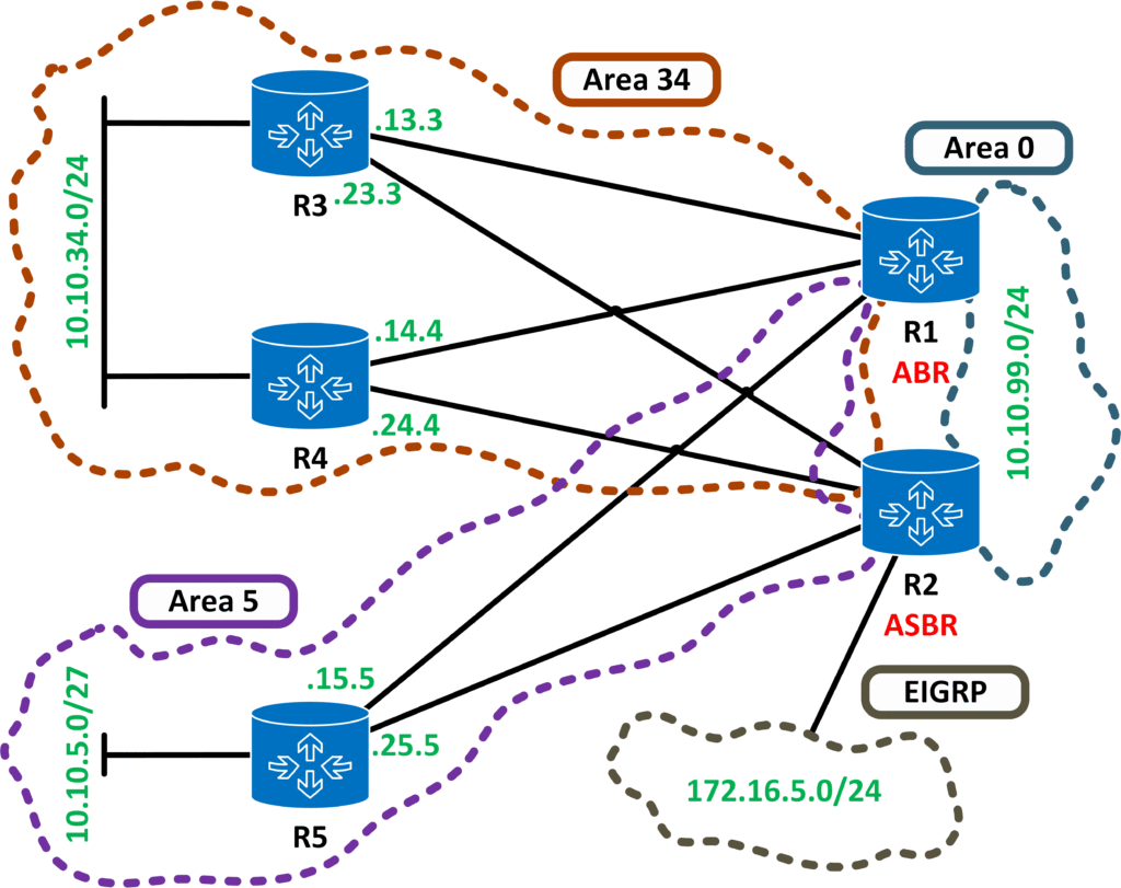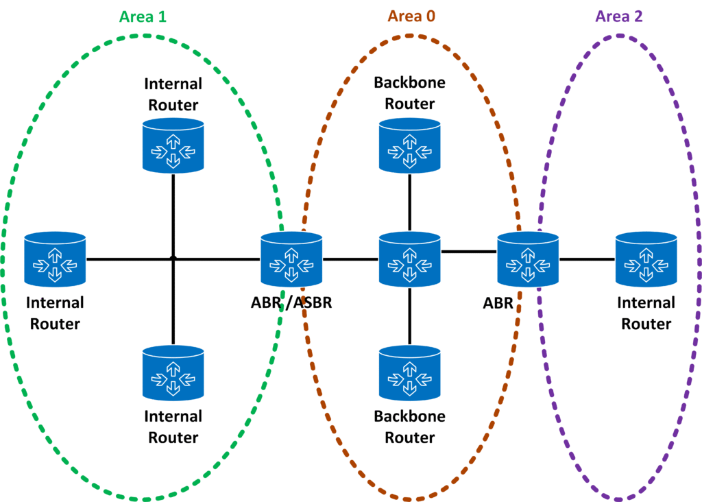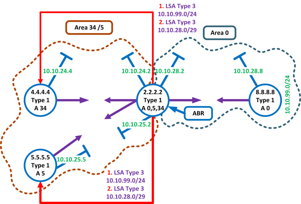 #show ip ospf border-routers OSPF Router with ID (7.7.7.7) (Process ID 1) Base Topology (MTID 0) Internal Router Routing Table Codes: i – Intra-area route, I – Inter-area route i 4.4.4.4 [1] via 10.2.2.17, GigabitEthernet0/1,ABR,Area1,SPF 3 i 5.5.5.5 [1] via 10.2.2.21, GigabitEthernet0/2,ABR,Area1,SPF 3 I2.2.2.2 [3] via 10.2.2.21, GigabitEthernet0/2,ASBR,Area1,SPF 3 I 2.2.2.2 [4] via 10.2.2.17, GigabitEthernet0/1,ASBR,Area1,SPF 3 I3.3.3.3 [2] via 10.2.2.17, GigabitEthernet0/1,ASBR,Area1,SPF 3