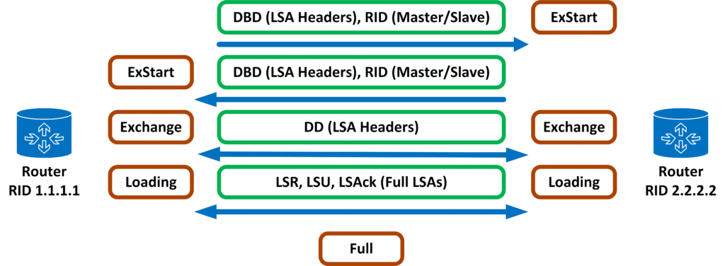 Po określeniu roli Master-a, rutery kontynuują wymianę wiadomości DBD zawierających dane LSID oraz numery sekwencyjne wszystkich struktur LSA, w celu określenia powyższych punktów 1 oraz 2. Następnie relacja przechodzi w stan „Loading State” rozpoczynając następujący cykl zdarzeń: