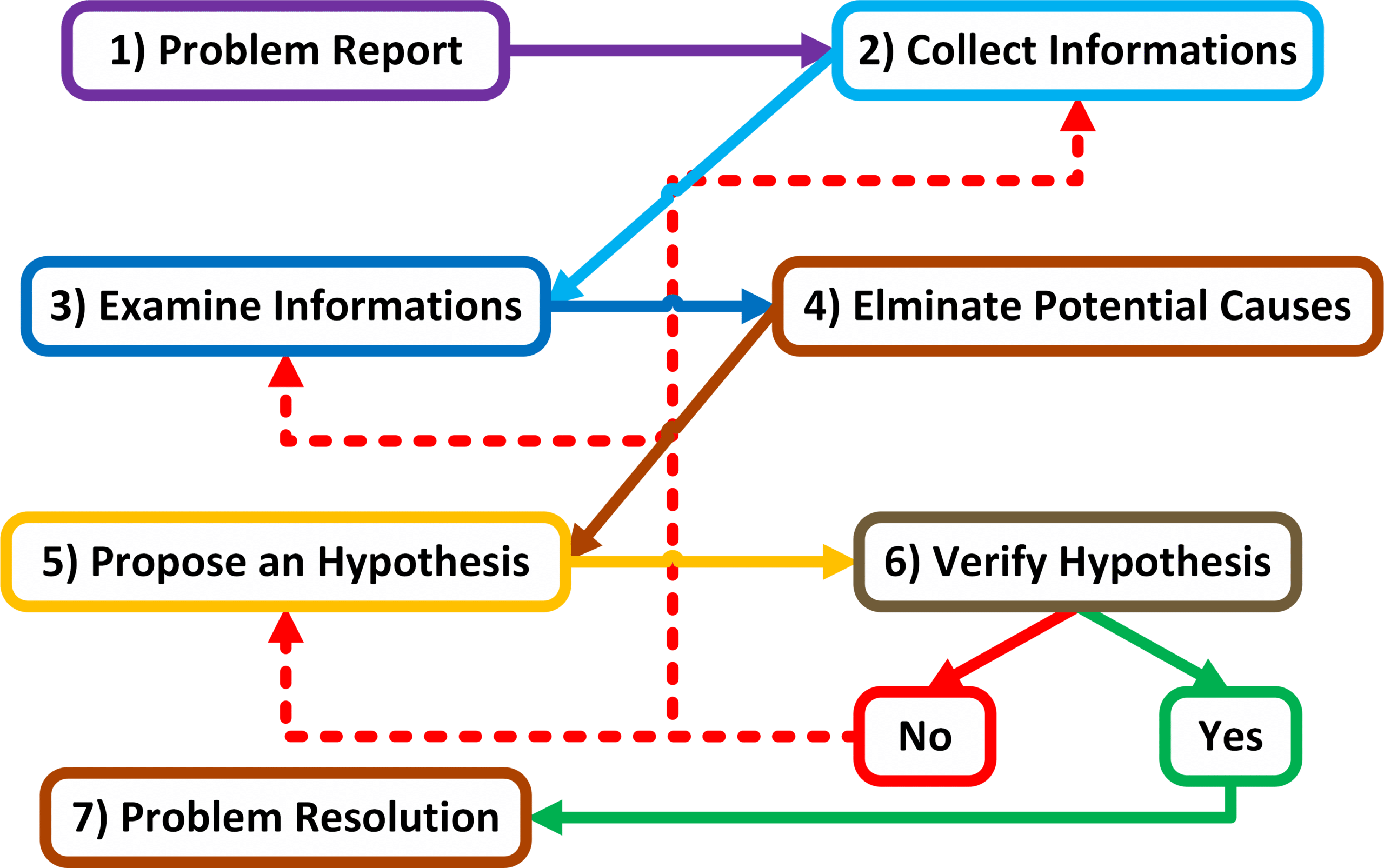 Collect Informations – Zebranie dodatkowych informacji za pomocą dedykowanych narzędzi sieciowych czy rozmów z użytkownikami dotkniętych danym problemem.