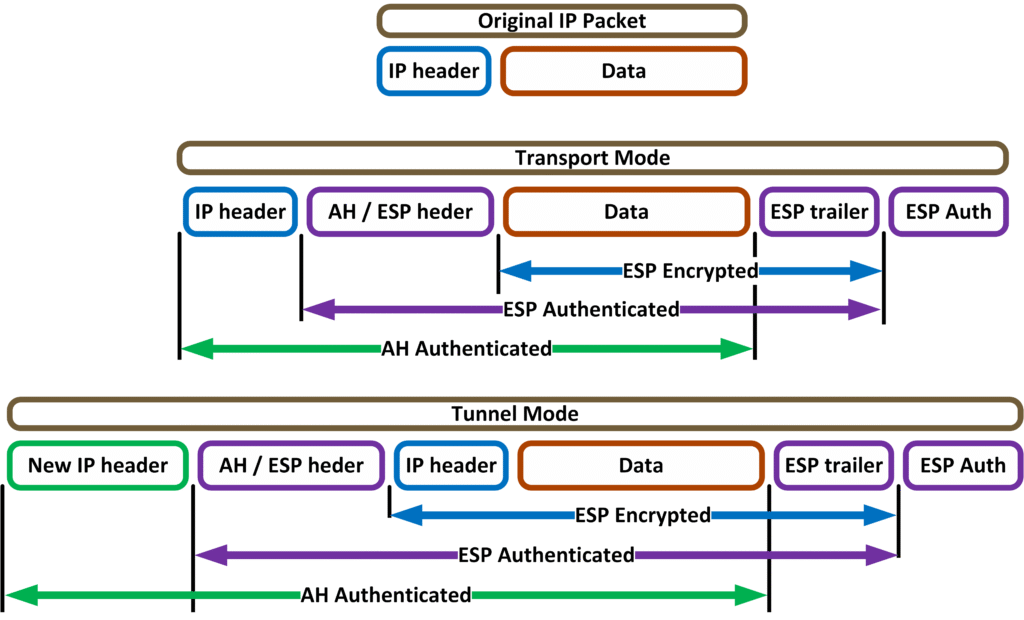 • ESP (Encapsulating Security Payload) – Zapewnia poufność osiąganą za pomocą szyfrowania, uwierzytelnienie drugiej strony połączenia oraz zapewnienia integralność danych.