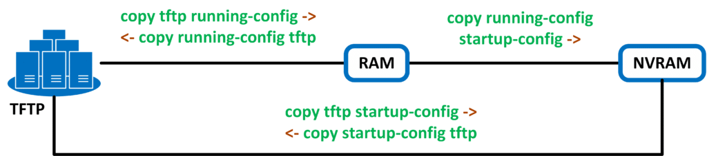 Aby przywrócić konfigurację systemu IOS, należy pobrać plik konfiguracyjny „running-config” z serwera TFTP bądź FTP, na miejsce pliku startowego „startup-config”. tym samym stare ustawienia zostaną nadpisane poprzez kopię zapasową. po zakończeniu kopiowania należy zresetować urządzenie Komedą [reload].