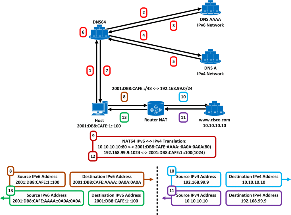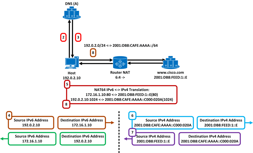 Ruter NAT64 przekształca źródłowy adres IPv4, na nowo stworzony adres IPv6 (192.0.2.10 -> C000:020A), co razem daje nowy docelowy adres IPv6, w następującej postaci (2001:DB8:CAFE:AAAA:: C000:020A).
