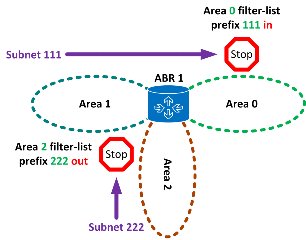 Określa filtrowaną sieć, wraz ze strefą (Area) z której pochodzi (Metoda ta umożliwia filtrowanie jedynie struktur LSA typu pierwszego jak i drugiego na ruterze ABR). W topologii Area 1 – Area 0 – Area 2 filtrowanie poprzez sumaryzację może być zastosowane pomiędzy strefą 1,0 dla sieci ze strefy pierwszej jak i zerowej oraz pomiędzy strefą 0, 2 dla sieci zerowej jak i drugiej, nie można jej jednak stosować pomiędzy np. strefą 1,0 dla sieci ze strefy drugiej).