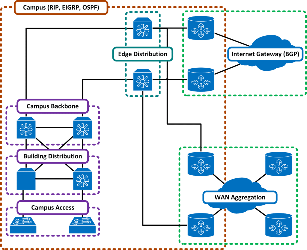 - Warstwa Edge Distribution – Łączy przełączniki warstwy rdzenia z routerami brzegowymi.