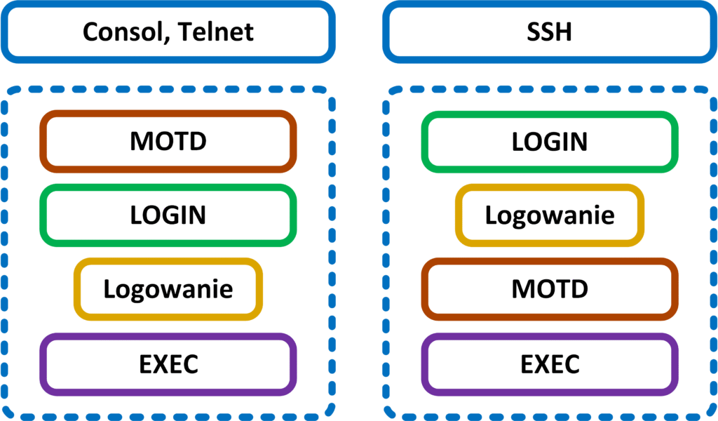 - EXEC – Stała wiadomość wyświetlana po zalogowaniu do sytemu IOS. W większości przypadków informuje osoby logujące się do systemu IOS, o wersji systemu czy adresacji urządzenia.
